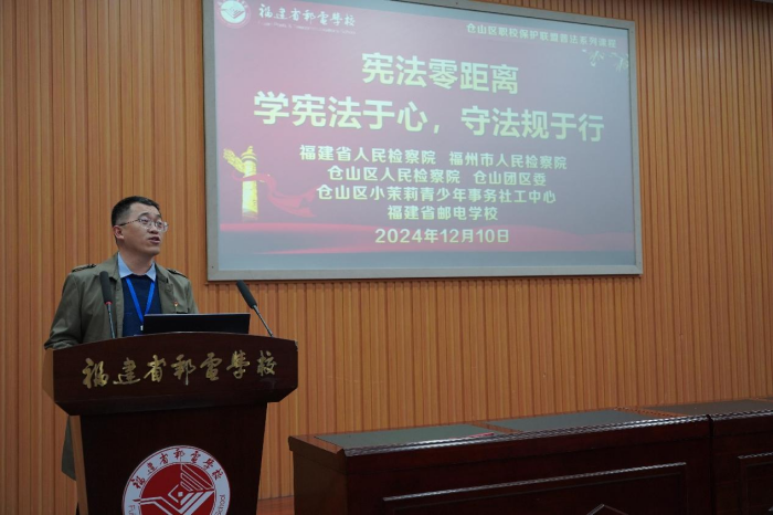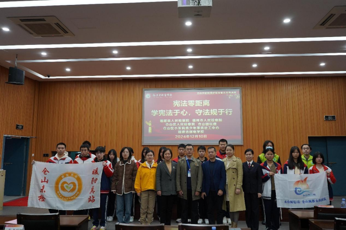 在全國第七個“憲法宣傳周”暨第十一個“國家憲法日”之際,為進一步弘揚憲法精神,加強憲法法治教育,增強學生法治觀念,提高學生法律意識,營造法治、和諧、安全的校園環境。12月10日下午,我校聯合福建省人民檢察院、福州市人民檢察院、倉山區人民檢察院、倉山團區委、倉山區小茉莉青少年事務社工中心共同開展以“憲法零距離——學憲法于心,守法規于行”為主題的憲法宣傳教育專題講座。福建省檢察院第九檢察部副主任張力琳、倉山區檢察院副檢察長王元龍、我校黨委委員、副校長林鵬等領導應邀出席,來賓及師生代表共計300余人參加。活動由學生與保衛科副科長劉江峰主持。
