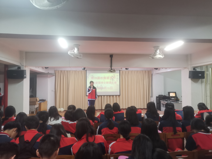 來自各班的二十八組共四十一名選手參加了比賽。同學們以飽滿的精神面貌,真摯的情感,朗誦了《滿江紅》《過零丁洋》《念奴嬌·赤壁懷古》《少年中國說》《七律·長征》《沁園春•雪》《青春中國》《祖國,我親愛的祖國》等作品,或激昂慷慨,或沉頌低吟,或深情款款,或鏗鏘有力,表達著自己對祖國、對中國傳統文化的熱愛。比賽現場氣氛熱烈,參與面廣,讓人置身于濃濃的優秀傳統文化氛圍之中。