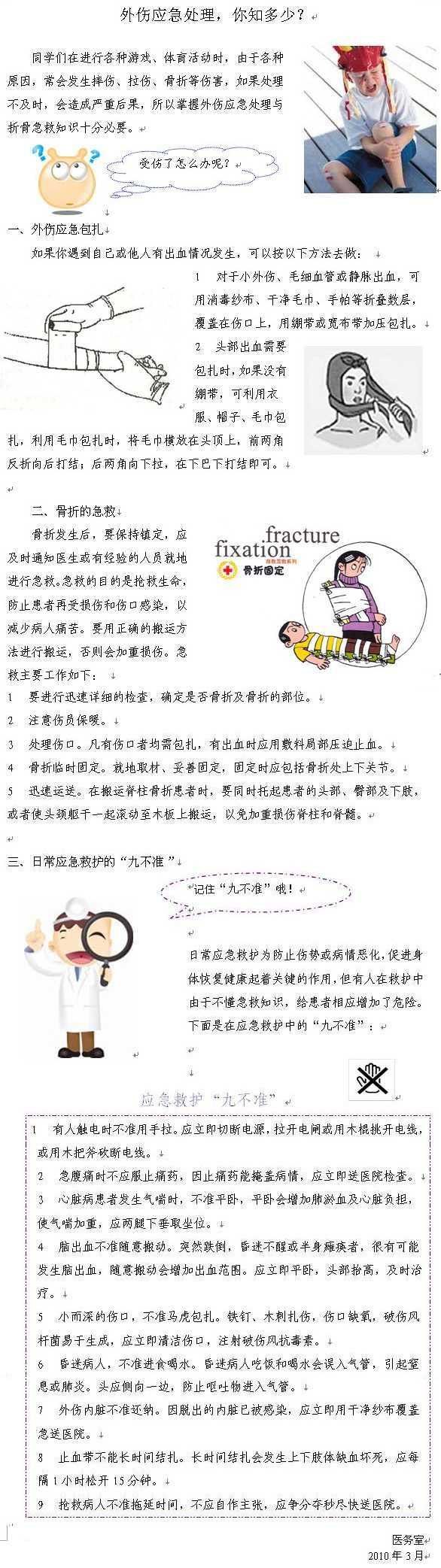 您現(xiàn)在的位置: 首頁 > 德育教育 > 健康常識健康常識 外傷應(yīng)急處理 發(fā)布時間:2010-03-01 //echo ;?> 來源:校醫(yī)務(wù)室點(diǎn)擊: 上一篇:預(yù)防艾滋病 下一篇:腸道傳染病