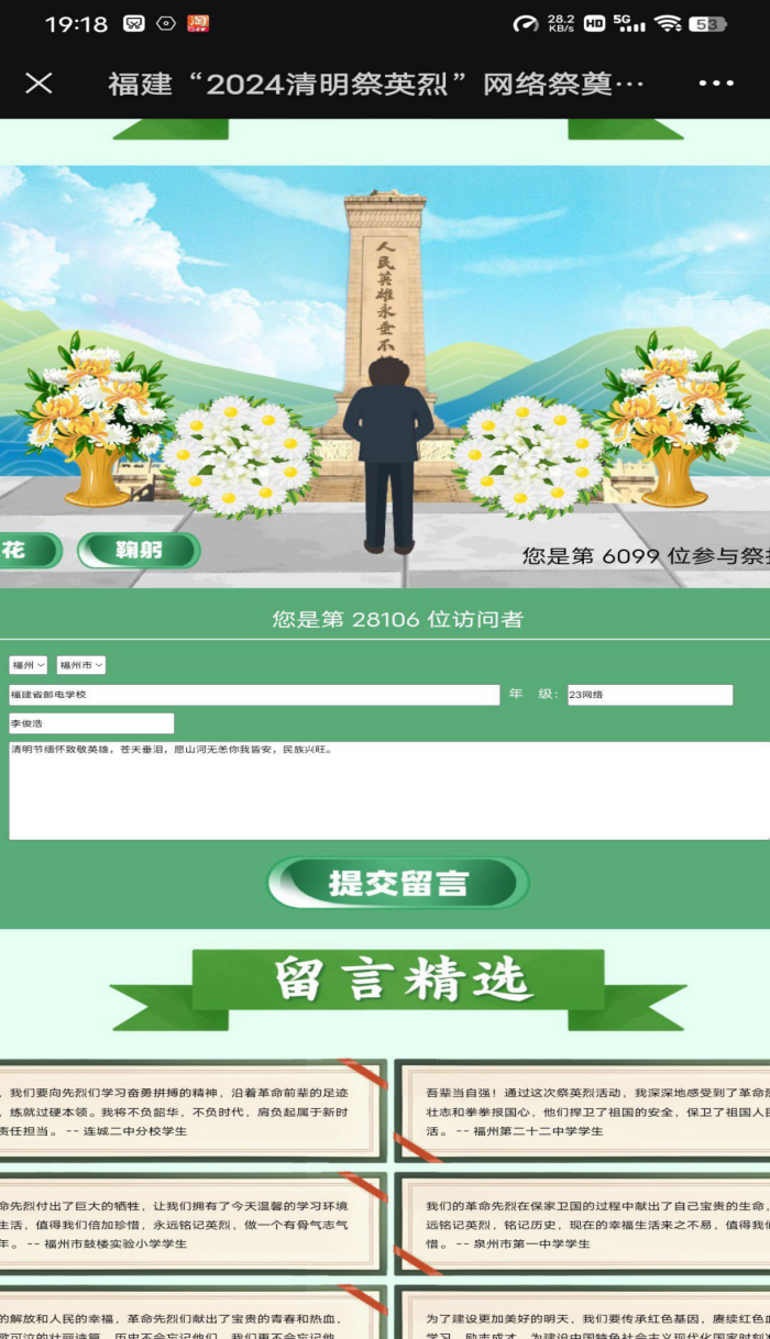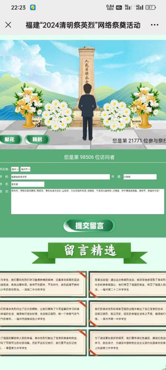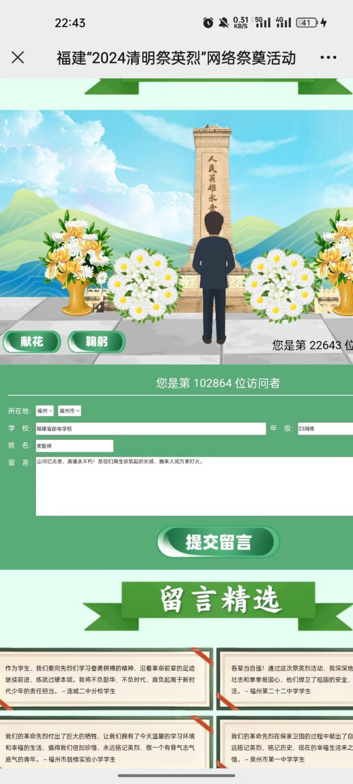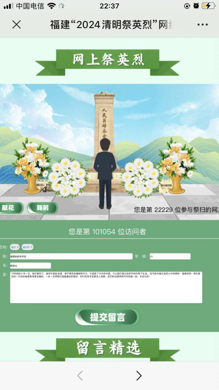 致敬英烈,慎終追遠。福郵學子們通過“清明祭英烈”網絡祭奠活動,為革命烈士鞠躬獻花,留言寄語,表達哀思。