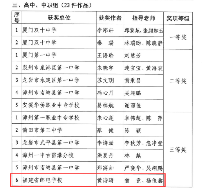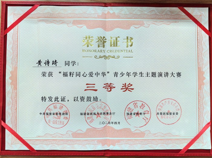 日前,由中共福建省委統戰部、福建省民族與宗教事務廳、福建省教育廳、共青團福建省委聯合舉辦的“福籽同心愛中華”青少年學生主題演講大賽圓滿落下帷幕,大賽共評選出高中、中職組一等獎2名、二等獎5名、三等獎7名、優秀獎9名。我校參賽選手黃詩琦在團委翁競老師、楊佳鑫老師指導下,榮獲三等獎,我校也是唯一獲獎的省屬中職學校。