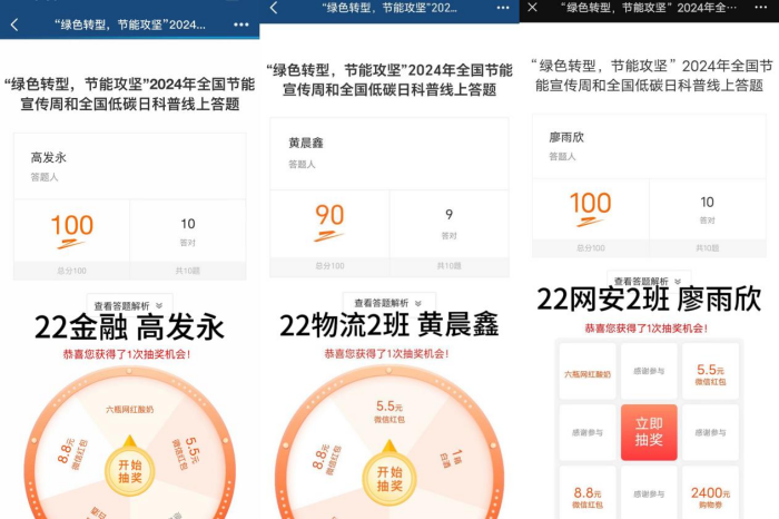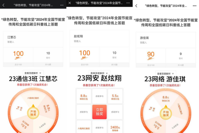 活動(dòng)期間,校團(tuán)委還組織各班級(jí)、各團(tuán)支部進(jìn)行綠色低碳線上答題,普及推廣綠色環(huán)保知識(shí),推動(dòng)了綠色發(fā)展理念在校園中“動(dòng)起來(lái)”“傳下去”。