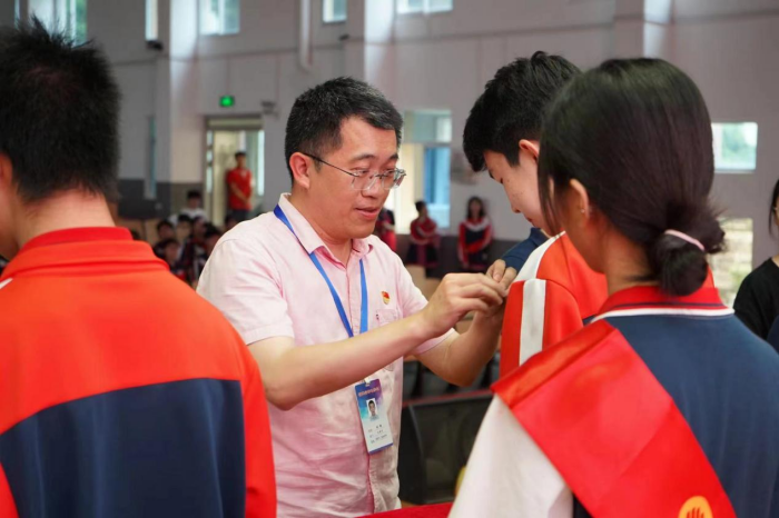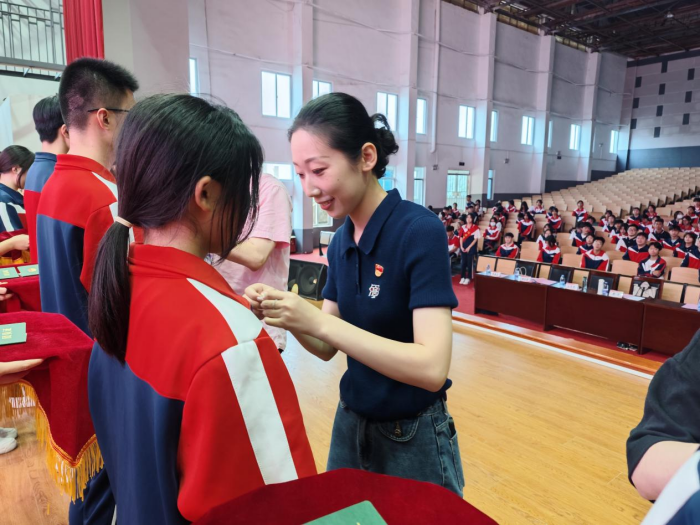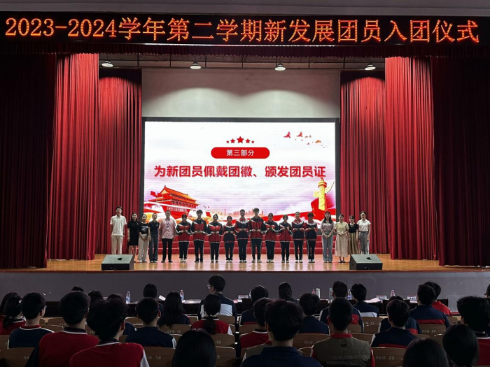 方圓老師宣讀2023-2024學年第二學期新發展團員名單。校領導和與會老師為新發展團員代表佩授團徽、發放團員證,并合影留念。