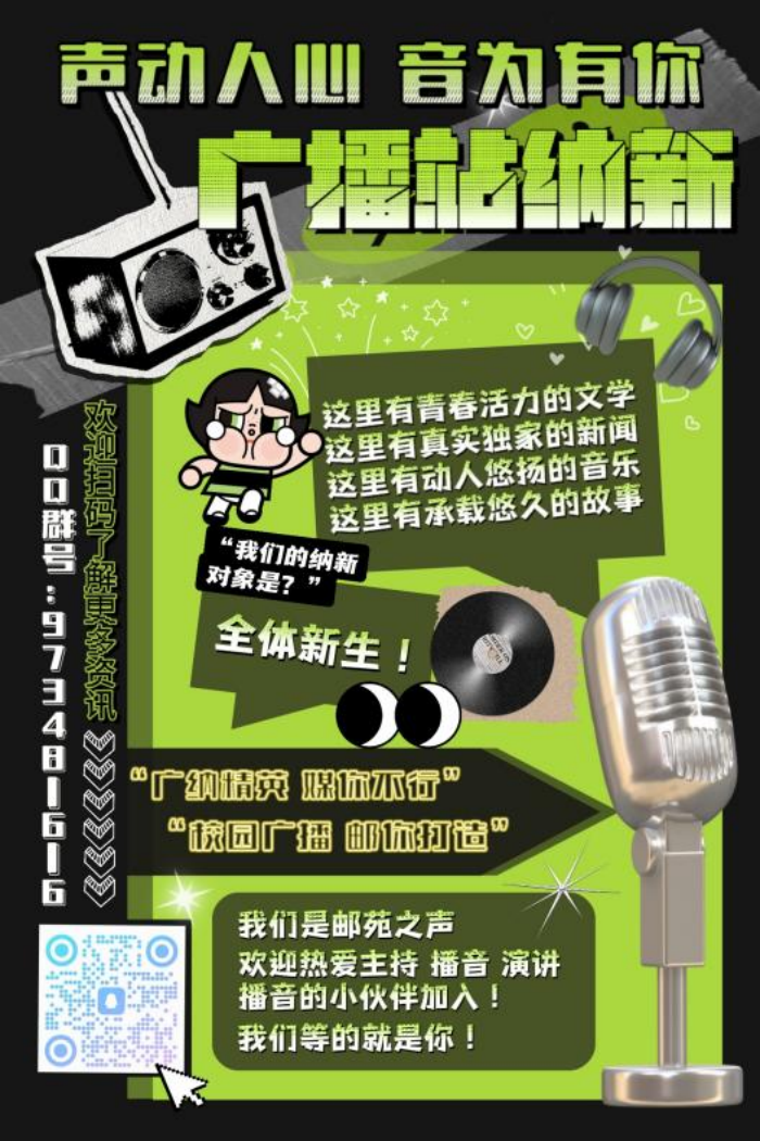這里是郵苑之聲廣播站,我們用聲音承載故事、以頻率展示青春,廣納精英沒你不行,在這里一切精彩“郵”你訴說,校園廣播“郵”你打造!