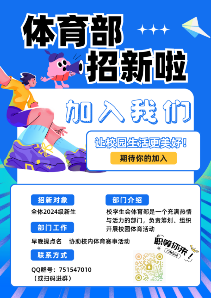 體育部,熱愛運動的同學歡迎加入!我們組織各類體育賽事,讓校園充滿活力。參與體育部,你不僅能鍛煉身體,還能結交志同道合的朋友。在這里,你可以學到如何組織體育活動,提升自己的團隊合作能力和領導力。