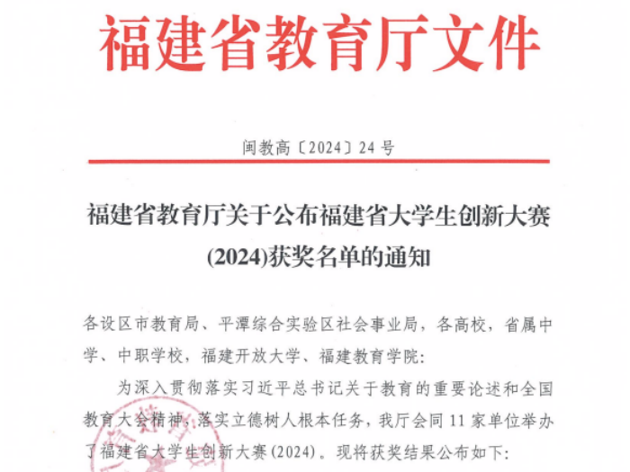 日前,福建省教育廳公布了福建省大學生創新大賽(2024)獲獎名單。我校參加本屆大賽職教賽道暨第八屆黃炎培海峽職業教育創新創業大賽,共斬獲4枚銀牌、1枚銅牌,獲獎率達100%,實現了我校創新創業大賽成績的歷史性突破。