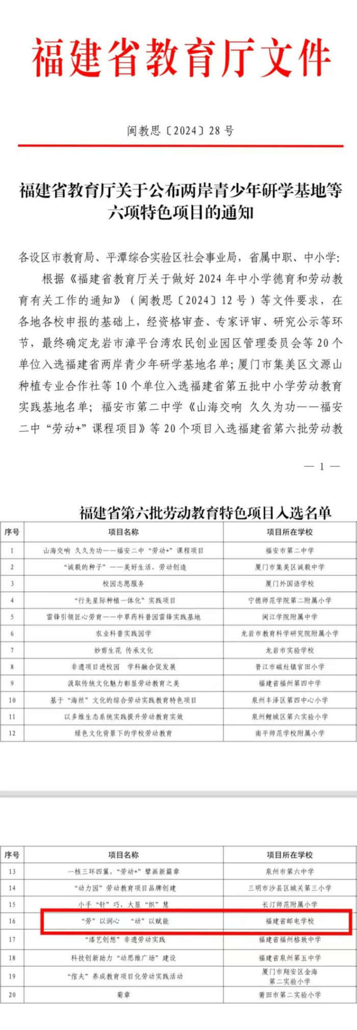近日,福建省教育廳發(fā)布《福建省教育廳關于公布兩岸青少年研學基地等六項特色項目的通知》,我校《“勞”以潤心 “動”以賦能》成功入選福建省第六批勞動教育實踐特色項目名單。據(jù)悉,我校是福建省唯一入選的中等職業(yè)學校。