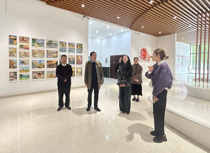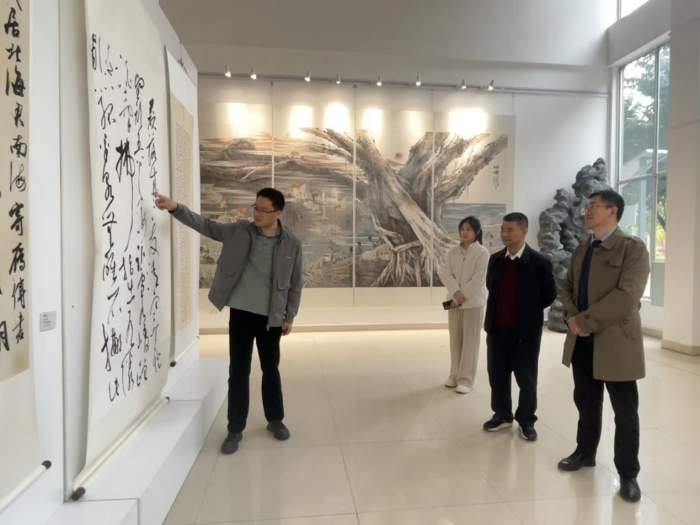 在湯國榮書記帶領下,林鵬副校長一行實地參觀美術與設計學院師生藝術作品展覽與書法作品展區、鋼琴博物館、國藝學院古琴與表演專業木工實訓室。通過觀摩非遺技藝、藝術成果展覽及學生創意工坊,雙方圍繞藝術教育與共青團工作的融合路徑展開交流。