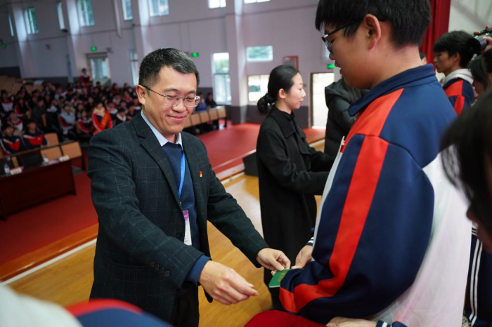 入團儀式在莊嚴肅穆的國歌聲中拉開序幕,全體肅立,齊聲高唱國歌,行注目禮。團委副書記方圓老師為大家宣讀新發展團員名單。隨后,校領導和與會老師為新發展團員佩戴團徽、頒發團員證并合影留念。