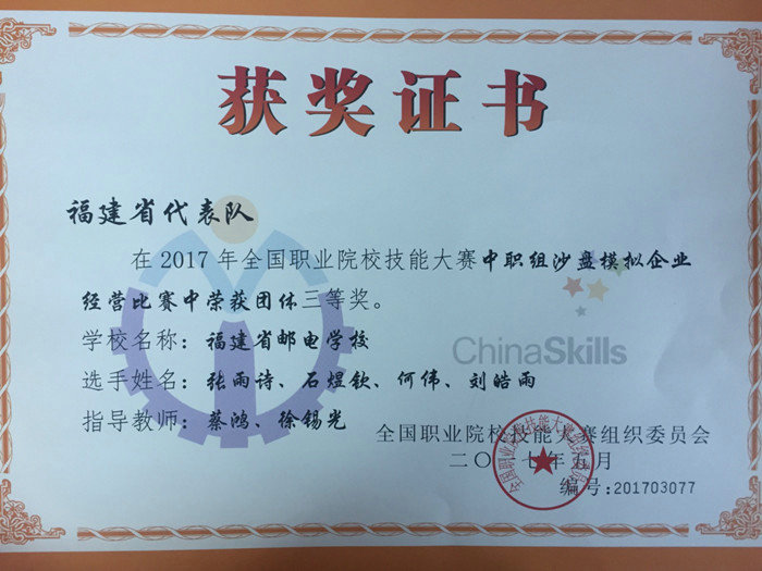 喜訊:我校獲2017全國職業院校技能大賽(中職組)“沙盤模擬企業經營”賽項三等獎