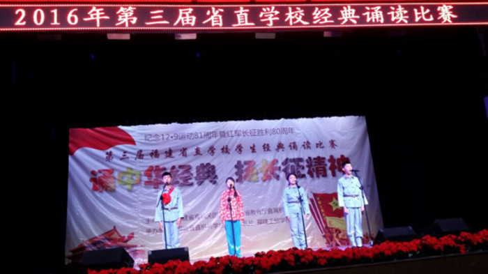 11月27日上午,由福建省直機(jī)關(guān)團(tuán)工委、福建省教育廳直屬機(jī)關(guān)團(tuán)委主辦,省直機(jī)關(guān)學(xué)校團(tuán)建聯(lián)系片承辦的第三屆省直學(xué)校經(jīng)典誦讀比賽在福建工貿(mào)學(xué)校舉行。本次誦讀比賽的主題為“誦中華經(jīng)典,揚(yáng)長(zhǎng)征精神”,來(lái)自20所院校(中職校12所,本科高職院校8所)參加了比賽。賽前,我校團(tuán)委高度重視,從各班級(jí)精心挑選4名同學(xué)組成參賽隊(duì),他們分別是15信息技術(shù)大專班的施詩(shī)敏和陳鈴俐、16通信升學(xué)班江海、16網(wǎng)絡(luò)五專班方鴻霖(指導(dǎo)老師:吳禹、陳蔚、劉菁雯)。
