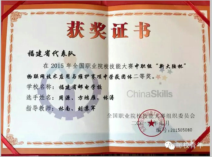 6月18日,由教育部、北京市人民政府、科學技術部、工業和信息化部等31家單位共同主辦,北京市教育委員會等單位承辦,北京新大陸時代教育科技有限公司、工業和信息化職業教育教學指導委員會等單位協辦的2015年全國職業院校技能大賽(中職組)“新大陸杯”物聯網技術應用與維護大賽在北京豐臺區園博園隆重舉行,來自全國28個省市79支參賽隊的237名選手匯聚一堂、比拼技能。我校代表隊憑借著扎實的功底和穩定的發揮,從近80支參賽隊中脫穎而出,勇奪團體二等獎,再一次展示了我校物聯網技術應用專業的教研水平以及我校師生奮發進取的精神風貌。