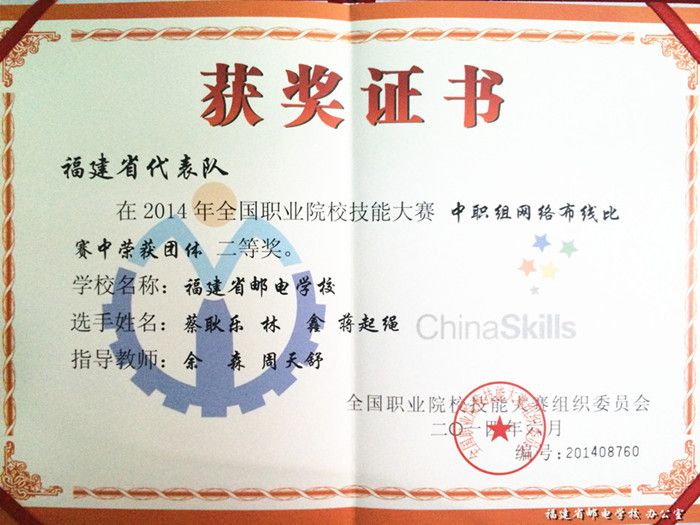 我校喜獲2014年全國技能大賽(中職組)網絡綜合布線比賽團體二等獎