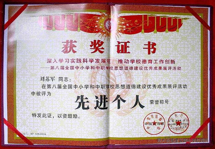 經(jīng)專家評審委員會和活動組委會聯(lián)合推薦,福建省郵電學校被授予第八屆全國中小學和中職學校思想道德建設(shè)優(yōu)秀成果展評活動“職業(yè)學校德育先進單位”和“集體一等獎”榮譽稱號,王福貴校長、劉蘇軍副校長分別獲得“德育工作先進校長”、“先進個人”。此外,學校推薦的9篇論文全部獲獎,其中5篇獲得一等獎,4篇獲得二等獎。