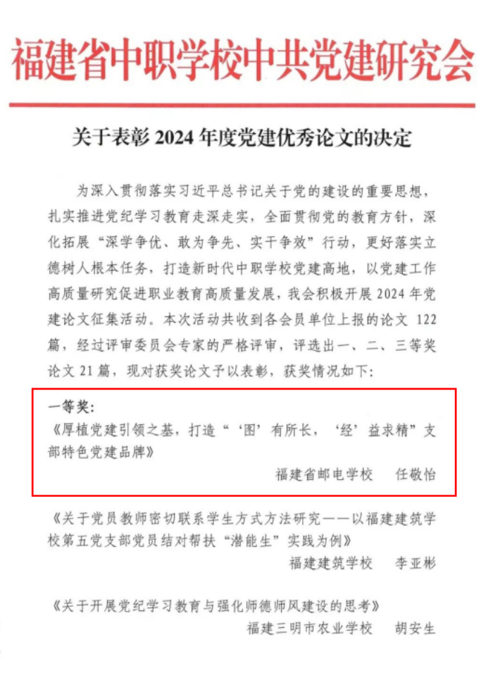 近日,福建省中職學校中共黨建研究會印發了《關于表彰2024年度黨建優秀論文的決定》,對2024年度黨建論文征集活動中的獲獎論文予以表彰。本次參評論文共有122篇,評選出一、二、三等獎21篇。我校任敬怡老師撰寫的論文《厚植黨建引領之基,打造“‘圖’有所長,‘經’益求精”支部特色黨建品牌》榮獲一等獎。