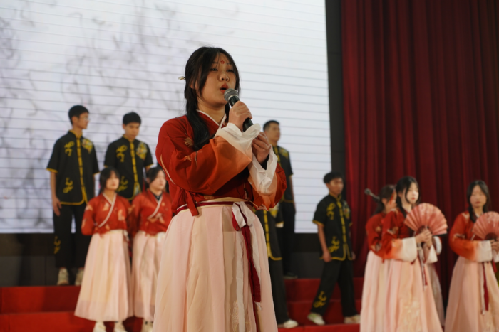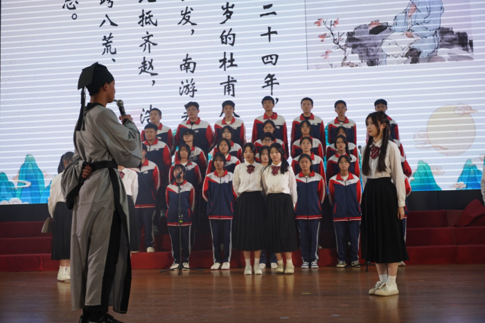 第二篇章經(jīng)典誦讀優(yōu)秀作品展演中,同學(xué)們依次登臺(tái)展演《觀滄海》《短歌行》《望岳》等古詩(shī)文,觀眾在品讀紅色經(jīng)典的同時(shí),賡續(xù)了民族精神。