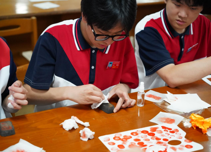 活動現場設剪紙藝術、碑刻拓印兩大體驗區。第二課堂指導老師通過實物展陳、技藝演示、經典解讀“三維一體”的教學模式,系統闡釋剪紙藝術自南北朝至今1500余年的發展脈絡。學生在老師的細心指導下,手執刀具如握畫筆,遵循“折—繪—刻—展”的四步工藝術,匠心獨具地完成了充滿個人風格的剪紙作品。拓印體驗區同步開展金石傳拓實踐,師生通過選碑、濕紙、覆膜、捶拓等七道工序,在墨香氤氳中完成金石文脈的現代轉譯。當宣紙揭啟瞬間,斑駁文字與歷史溫度躍然呈現,生動詮釋中華文明綿延不絕的生命力。