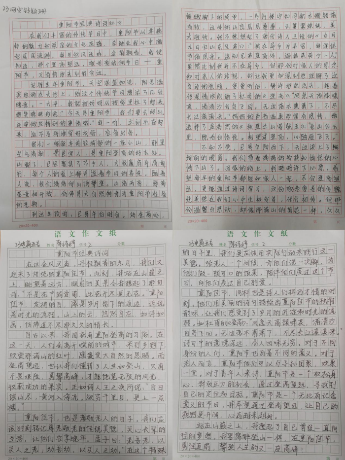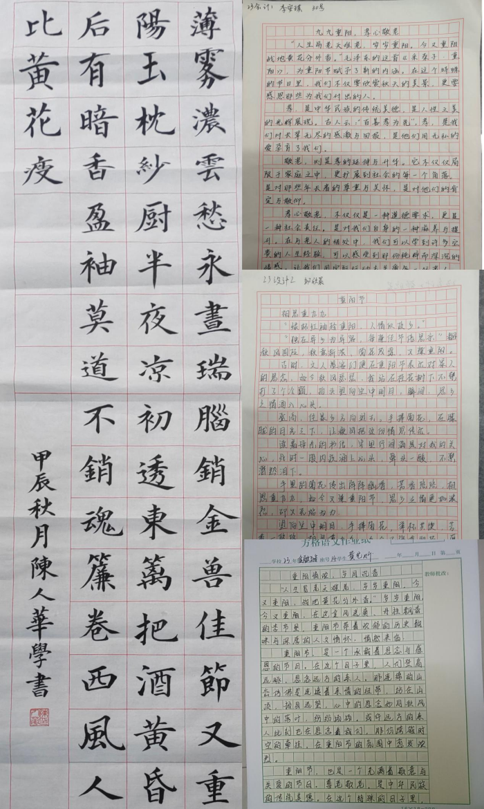 同聚重陽,書寫美好,誦讀經典。同學們書寫并誦讀了重陽節經典詩詞作品,通過追溯中華文明孝老敬親的歷史淵源,汲取中華優秀傳統文化養分,切實增強民族文化自信。