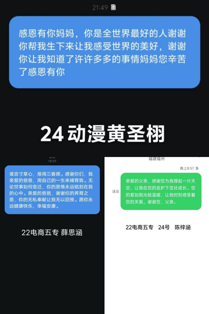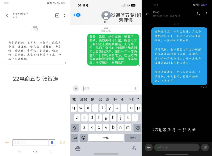 感恩有您,情暖重陽。活動期間,在校學子通過電話、短信、微信等方式表達對家中長輩的思念與祝福。一聲聲“爺爺,重陽節快樂”“奶奶,您辛苦了”“祝您身體健康,萬事如意”等簡單質樸的話語飽含了同學們的片片真情,體現了福郵學子對長輩的感激和敬意。