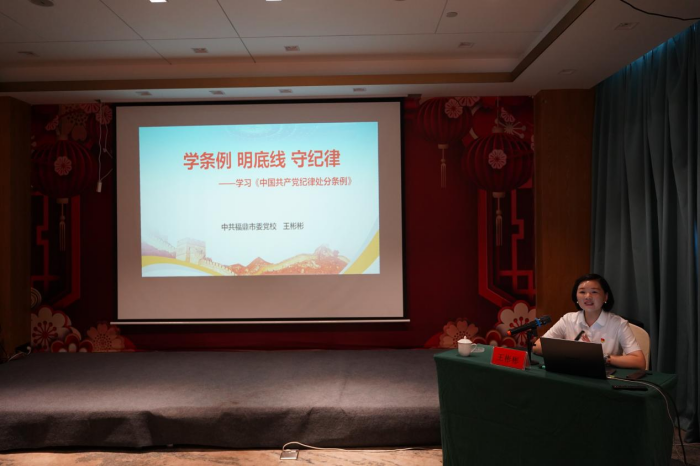 會議邀請了中共福鼎市委黨校王彬彬同志講授黨紀學習教育專題輔導講座,王彬彬同志以《學條例 明底線 守紀律——學習<中國共產黨紀律處分條例>》為題開設黨紀學習教育專題輔導講座,她從《條例》修訂背景與意義、《條例》修訂的重點內容以及基層如何堅守黨紀底線等三個方面,結合大量典型的反面案例,對新修訂的《條例》進行了詳細生動的解讀。通過專題輔導和現場互動交流,黨員干部進一步加深對《條例》內涵要義的理解,更加精準把握《條例》的實踐要求。