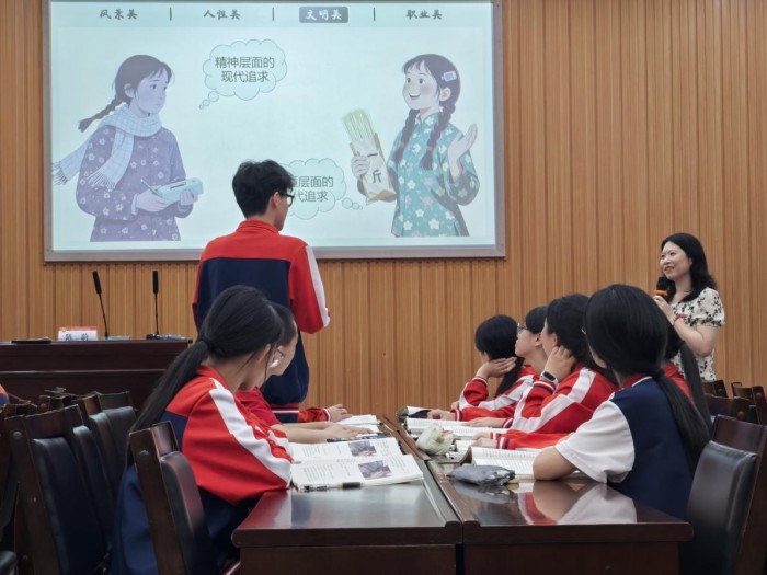 陳蔚老師開設了題為《<哦,香雪>:傳統美與現代美的碰撞》的公開課。課堂上,陳蔚老師帶領學生解讀文本中的風景美、人性美、文明美,引導學生感悟傳統與現代共生的文化生態以及普通人在時代變遷中的精神成長。