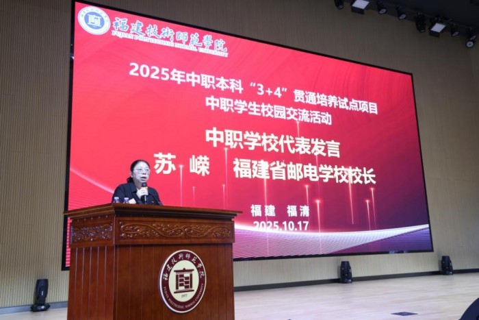 我校校長(zhǎng)蘇嶸作為中職學(xué)校代表發(fā)言。她表示,“3+4”貫通培養(yǎng)項(xiàng)目是福建省推進(jìn)現(xiàn)代職業(yè)教育體系改革的重要舉措,也是搭建技術(shù)技能人才成長(zhǎng)立交橋的關(guān)鍵載體,福建技術(shù)師范學(xué)院的遠(yuǎn)見與擔(dān)當(dāng)為中職學(xué)生開辟了本科教育通道,學(xué)校將堅(jiān)持深化校際協(xié)作,優(yōu)化課程體系、創(chuàng)新教學(xué)方法,筑牢學(xué)生基礎(chǔ),教育引導(dǎo)學(xué)生珍惜平臺(tái),錘煉專業(yè)技藝、培養(yǎng)核心素養(yǎng),立鴻鵠志、練真本領(lǐng)。