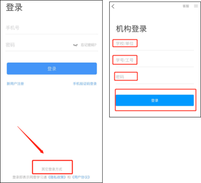 打開手機APP“學習通”,在登錄界面,點擊“其它登錄方式”。進入“機構(gòu)登錄”輸入下列信息:學校/單位:福建省郵電學校,學號:自己的學號(如20003200000),初始密碼:******(可咨詢班主任)
