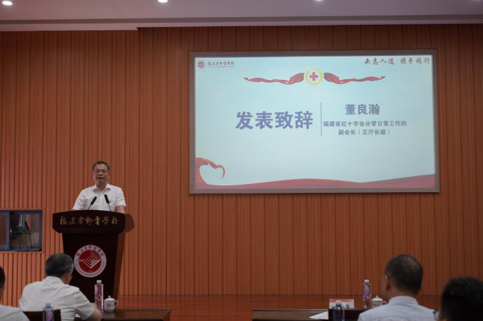 福建省紅十字會分管日常工作副會長董良瀚發表致辭。他向我校成立紅十字會表示祝賀,他指出,紅十字會是黨領導下的群團組織,要積極把握新時代學校紅十字工作的目標任務,把培養時代新人作為職責使命,在青少年學生中大力弘揚紅十字精神,傳播紅十字運動文化,倡導“關愛生命”“救在身邊”“生命接力”等文明新風尚,教育和引導青少年學生在人道實踐中培養責任意識、涵養博愛情懷,讓紅十字精神在校園中高高飄揚起來。