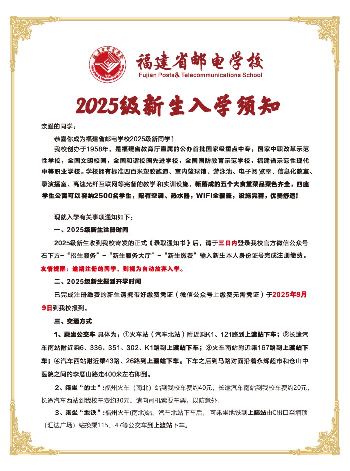 您現(xiàn)在的位置: 首頁 > 學(xué)校信息 > 通知公告通知公告 福建省郵電學(xué)校2025年新生入學(xué)須知 發(fā)布時間:2025-07-15 //echo ;?> 來源:招生辦公室點(diǎn)擊: 上一篇:福建省郵電學(xué)校2025年漳州市招生代碼 下一篇:福建省郵電學(xué)校關(guān)于防范虛假招生的嚴(yán)正聲明