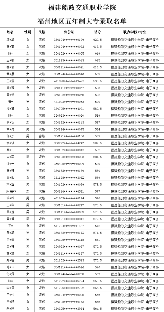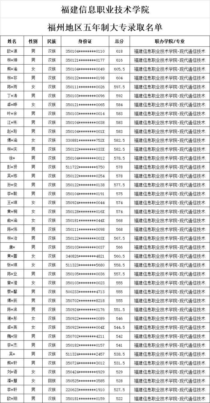 福建省郵電學校2025年福州地區3+2五年制大專錄取名單