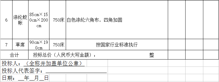 2、提供本項(xiàng)目供貨床上用品(棉胎、被套、草席、蚊帳、床單、枕套、枕芯共7件套)樣品各1件。