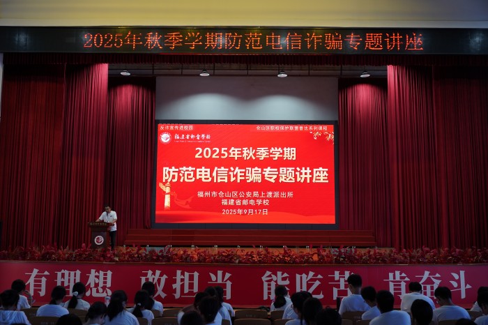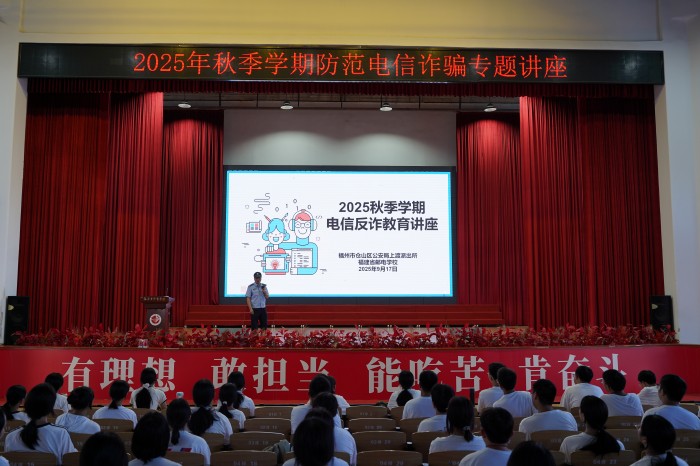 為進一步增強新生防范電信網絡詐騙的意識和能力,切實保障師生財產安全與校園穩定,9月17日下午,我校于禮堂舉辦2025年秋季學期防范電信詐騙專題講座,各班級教室設立分會場同步收看直播。講座特邀福州市倉山區上渡派出所李華警官為2025級新生授課,由學生與保衛科副科長劉江峰主持。