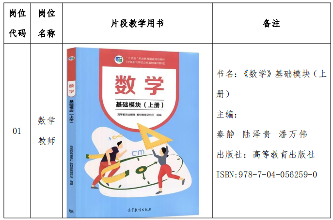 您現在的位置: 首頁 > 招聘就業 > 教師招聘教師招聘 2024年福建省郵電學校公開招聘工作人員面試有關事項公告(一) 發布時間:2024-05-23 //echo ;?> 來源:人事科點擊: 根據《2024年福建省省屬事業單位公開招聘工作人員方案(二)》要求,專任教師(崗位代碼01-06)面試采取片段教學形式(片段教學面試用書如下),面試時我校將提供相關用書。 福建省郵電學校 2024年5月23日 上一篇:關于2024年福建省郵電學校公開招聘工作人員筆試成績查詢及面試資格復審等有關事項的通知 下一篇:2024年福建省郵電學校公開招聘工作人員面試有關事項公告(二)